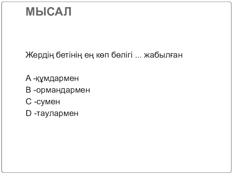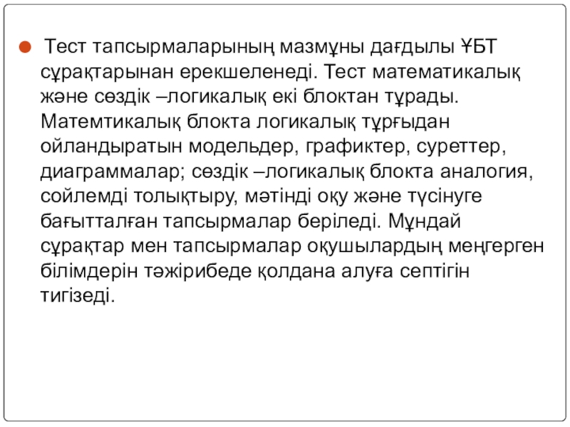 Слайд 4 Тест тапсырмаларының мазмұны дағдылы ҰБТ сұрақтарынан ерекшеленеді. Тест математикалық және