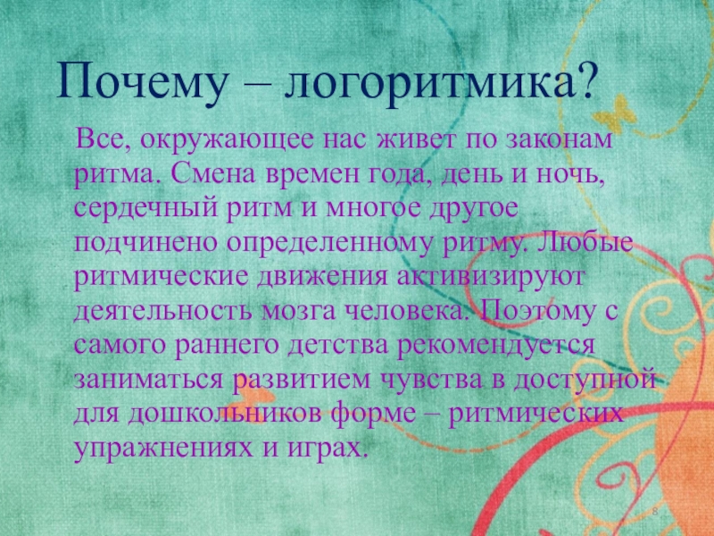 Логопедическая ритмика, являясь составной частью коррекционной ритмики, воздействует на моторику и речь.