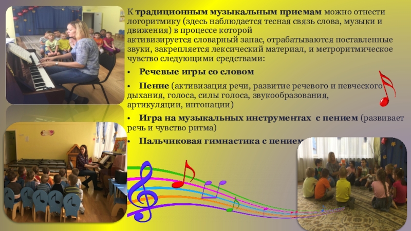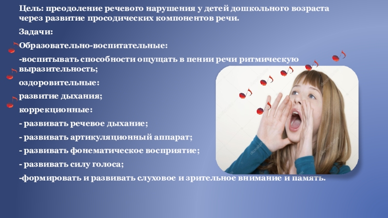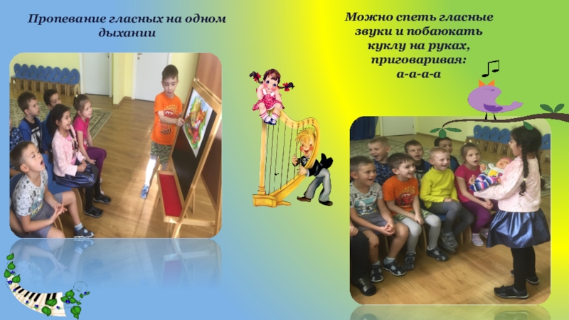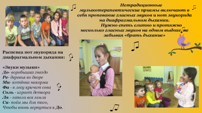 Нетрадиционные музыкотерапевтические приемы включают в себя пропевание гласных звуков и нот звукоряда на диафрагмальном дыхании.