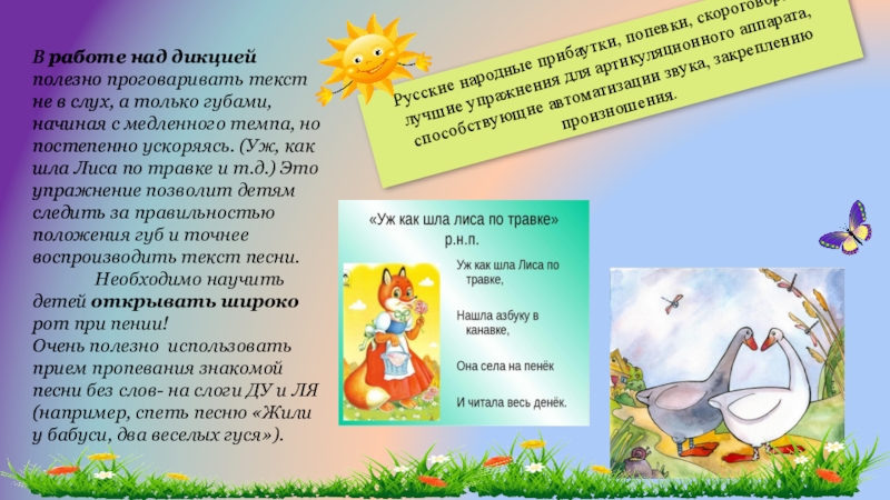 Русские народные прибаутки, попевки, скороговорки,-лучшие упражнения для артикуляционного аппарата, способствующие автоматизации звука, закреплению произношения.