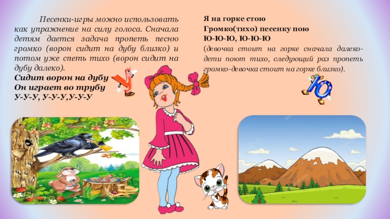 (девочка стоит на горке сначала далеко-дети поют тихо, следующий раз пропеть громко-девочка стоит на горке близко).