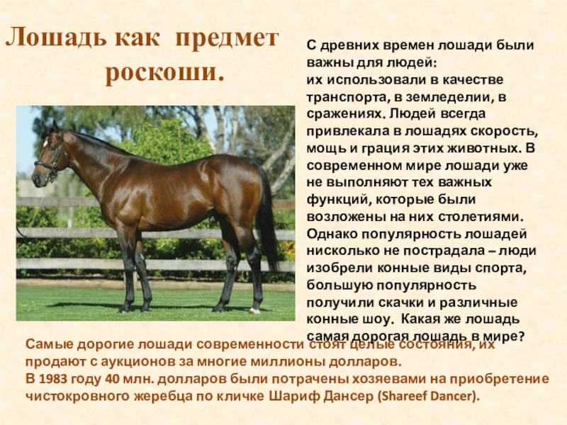 их использовали в качестве транспорта, в земледелии, в сражениях. Людей всегда привлекала в лошадях скорость, мощь и грация этих животных. В современном мире лошади уже не выполняют тех важных функций, которые были возложены на них столетиями. Однако популярность лошадей нисколько не пострадала – люди изобрели конные виды спорта, большую популярность получили скачки и различные конные шоу. Какая же лошадь самая дорогая лошадь в мире?