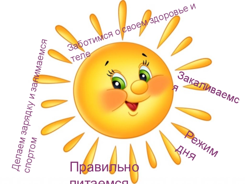 Закаливаемся Режим дняПравильно питаемсяЗаботимся о своем здоровье и телеДелаем зарядку и занимаемся спортом