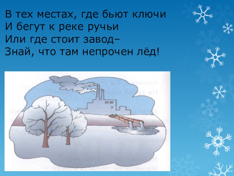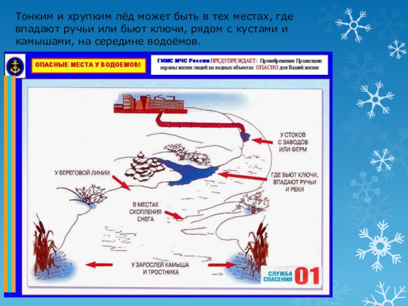 Слайд 6Тонким и хрупким лёд может быть в тех местах, где впадают