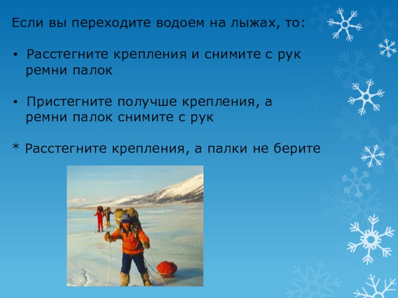Слайд 24Если вы переходите водоем на лыжах, то: