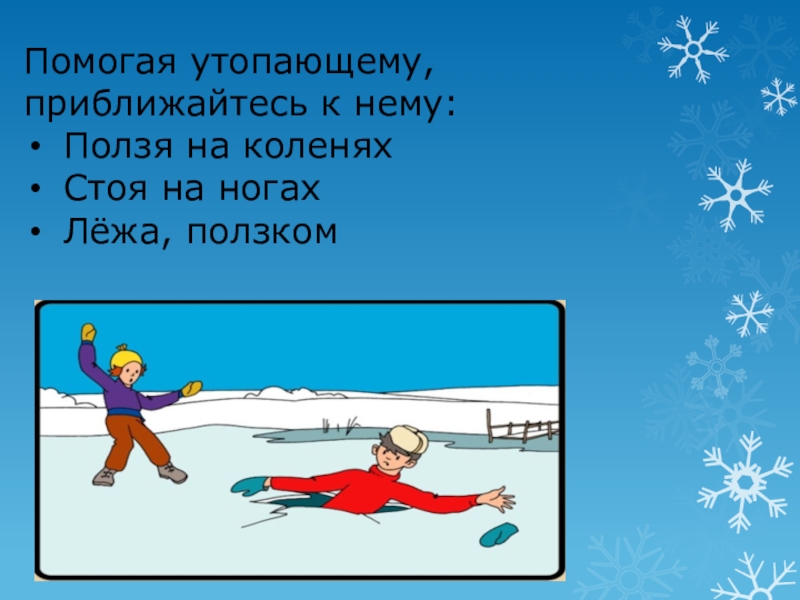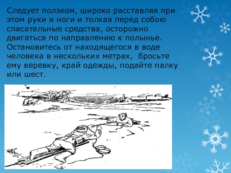 перед собою спасательные средства, осторожно двигаться по направлению к полынье.