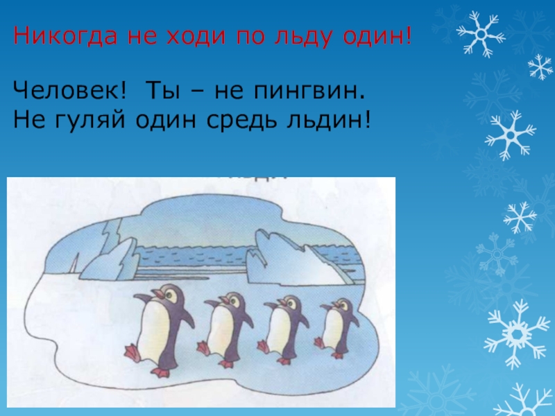 * нельзя ходить по льду во время оттепели, в одиночку, в темноте, с большим грузом;