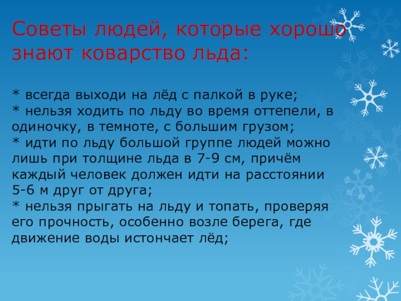 Слайд 3Советы людей, которые хорошо знают коварство льда: