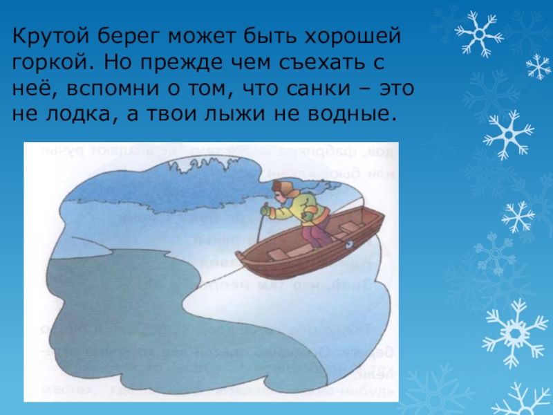 Слайд 9Крутой берег может быть хорошей горкой. Но прежде чем съехать с