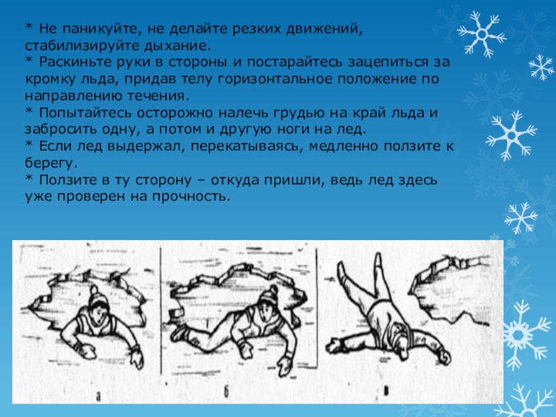 * Попытайтесь осторожно налечь грудью на край льда и забросить одну, а потом и другую ноги на лед.