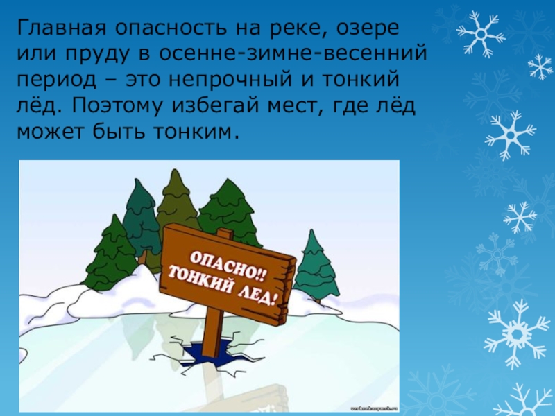 Слайд 2Главная опасность на реке, озере или пруду в осенне-зимне-весенний период –