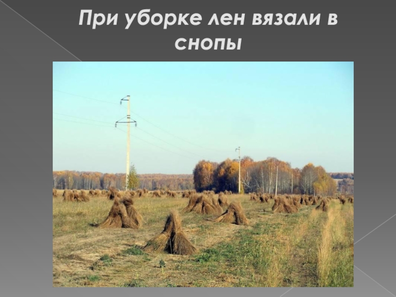 Слайд 4При уборке лен вязали в снопы