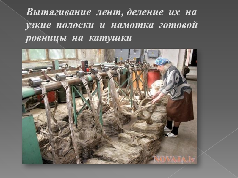 Слайд 16Вытягивание лент, деление их на узкие полоски и намотка готовой ровницы
