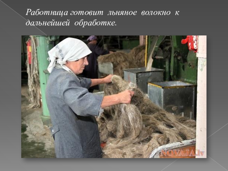 Слайд 12Работница готовит льняное волокно к дальнейшей обработке.