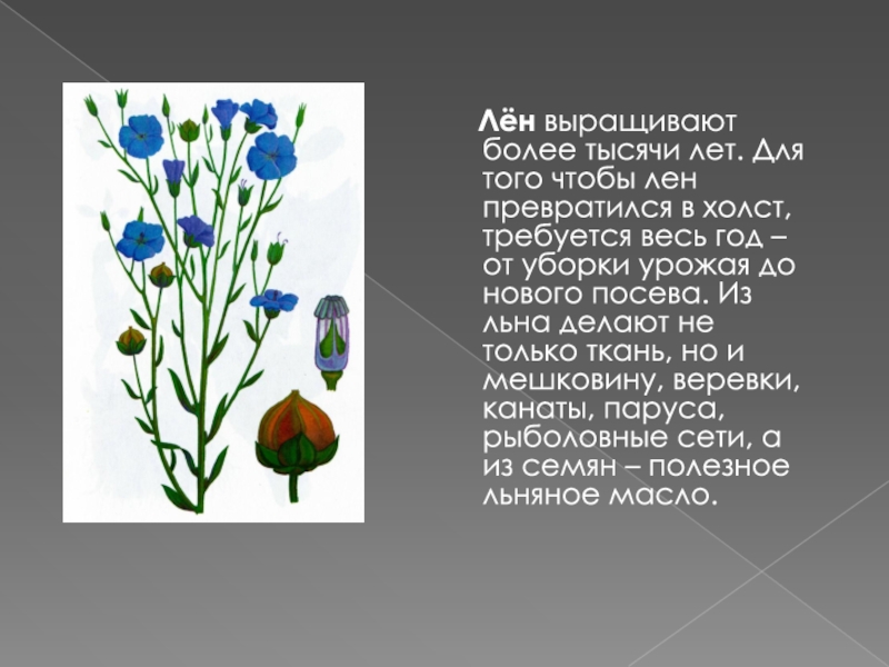 Слайд 2 Лён выращивают более тысячи лет. Для того чтобы лен превратился