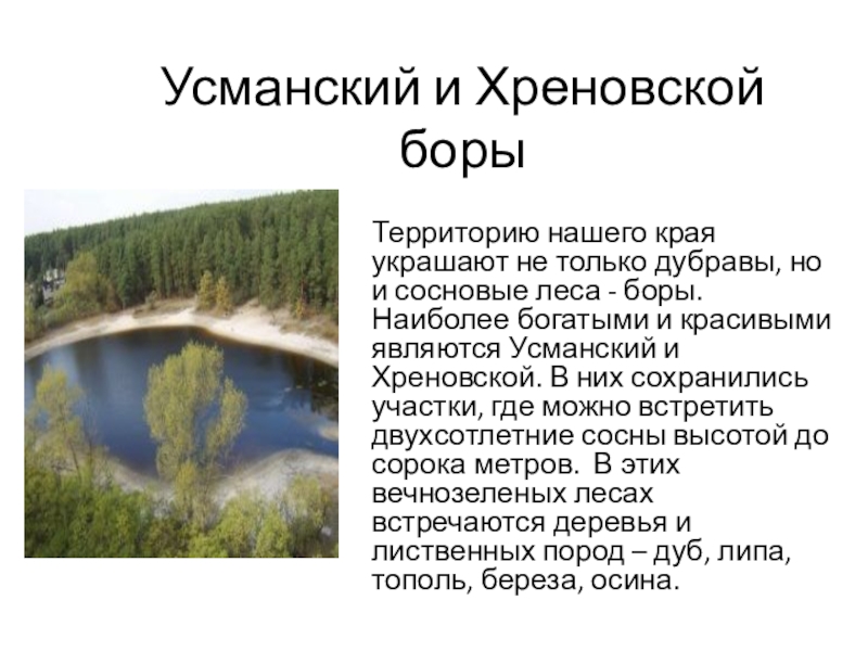 и сосновые леса - боры. Наиболее богатыми и красивыми являются Усманский и Хреновской. В них сохранились участки, где можно встретить двухсотлетние сосны высотой до сорока метров. В этих вечнозеленых лесах встречаются деревья и лиственных пород – дуб, липа, тополь, береза, осина.