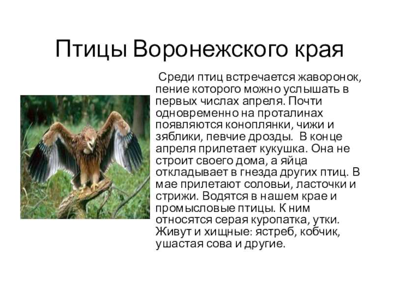 в первых числах апреля. Почти одновременно на проталинах появляются коноплянки, чижи и зяблики, певчие дрозды. В конце апреля прилетает кукушка. Она не строит своего дома, а яйца откладывает в гнезда других птиц. В мае прилетают соловьи, ласточки и стрижи. Водятся в нашем крае и промысловые птицы. К ним относятся серая куропатка, утки. Живут и хищные: ястреб, кобчик, ушастая сова и другие.