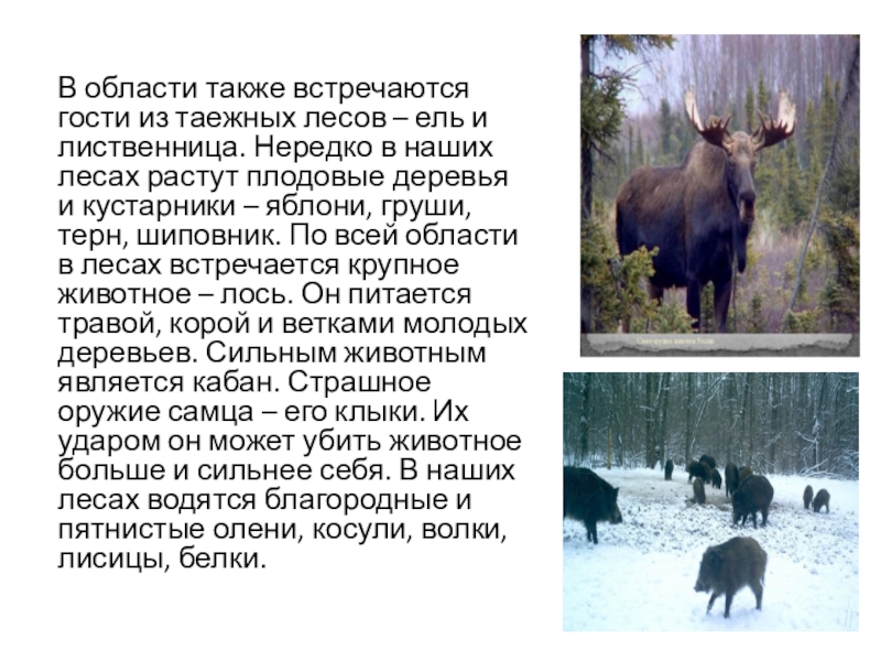 лиственница. Нередко в наших лесах растут плодовые деревья и кустарники – яблони, груши, терн, шиповник. По всей области в лесах встречается крупное животное – лось. Он питается травой, корой и ветками молодых деревьев. Сильным животным является кабан. Страшное оружие самца – его клыки. Их ударом он может убить животное больше и сильнее себя. В наших лесах водятся благородные и пятнистые олени, косули, волки, лисицы, белки.