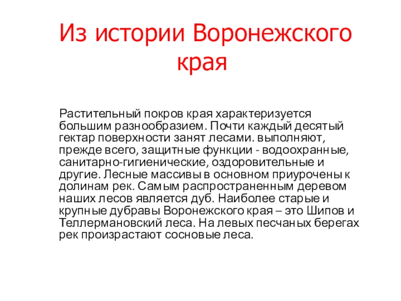 каждый десятый гектар поверхности занят лесами. выполняют, прежде всего, защитные функции - водоохранные, санитарно-гигиенические, оздоровительные и другие. Лесные массивы в основном приурочены к долинам рек. Самым распространенным деревом наших лесов является дуб. Наиболее старые и крупные дубравы Воронежского края – это Шипов и Теллермановский леса. На левых песчаных берегах рек произрастают сосновые леса.