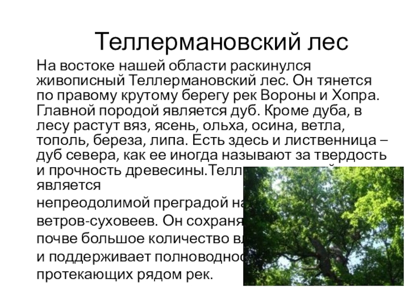 по правому крутому берегу рек Вороны и Хопра. Главной породой является дуб. Кроме дуба, в лесу растут вяз, ясень, ольха, осина, ветла, тополь, береза, липа. Есть здесь и лиственница – дуб севера, как ее иногда называют за твердость и прочность древесины.Теллермановский лес является