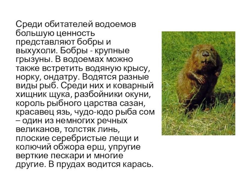 Слайд 16Среди обитателей водоемов большую ценность представляют бобры и выхухоли. Бобры -