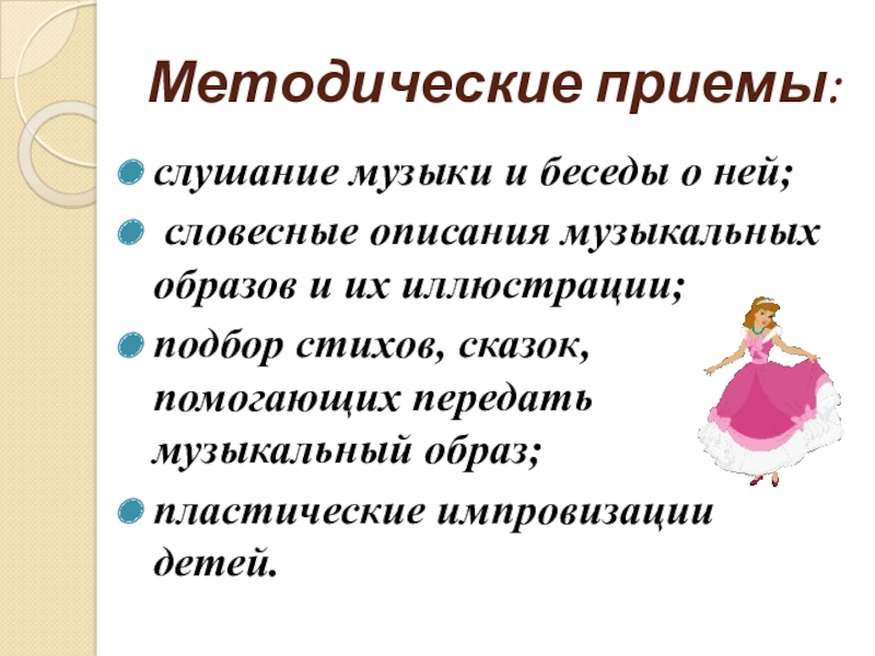 Методические приемы:слушание музыки и беседы о ней; словесные описания музыкальных образов и их иллюстрации; подбор стихов, сказок,