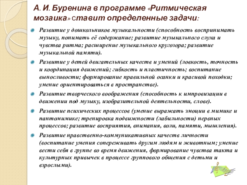 А. И. Буренина в программе «Ритмическая мозаика» ставит определенные задачи:Развитие у дошкольников музыкальности (способность воспринимать музыку, понимать
