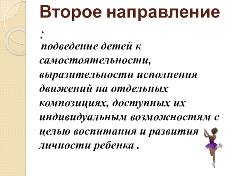 Второе направление :  подведение детей к самостоятельности, выразительности исполнения движений на отдельных композициях, доступных их индивидуальным