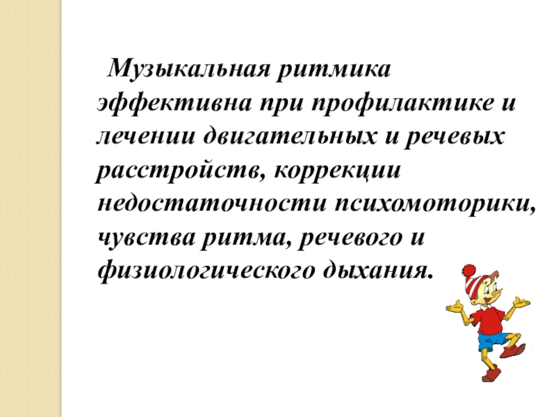 Слайд 4 Музыкальная ритмика эффективна при профилактике и лечении двигательных и