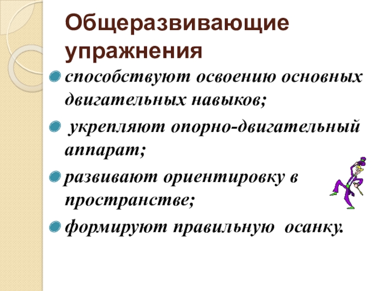 Общеразвивающие упражненияспособствуют освоению основных двигательных навыков; укрепляют опорно-двигательный аппарат; развивают ориентировку в пространстве;формируют правильную осанку.