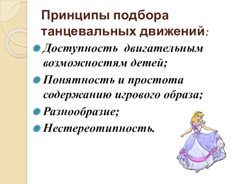 Принципы подбора танцевальных движений:Доступность двигательным возможностям детей;Понятность и простота содержанию игрового образа;Разнообразие;Нестереотипность.