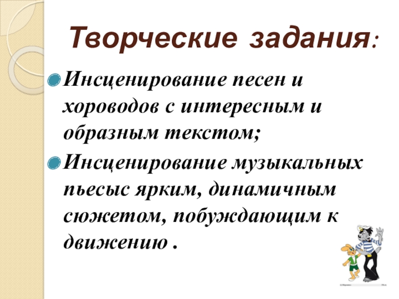 Творческие задания:Инсценирование песен и хороводов с интересным и образным текстом;Инсценирование музыкальных пьесыс ярким, динамичным сюжетом, побуждающим к