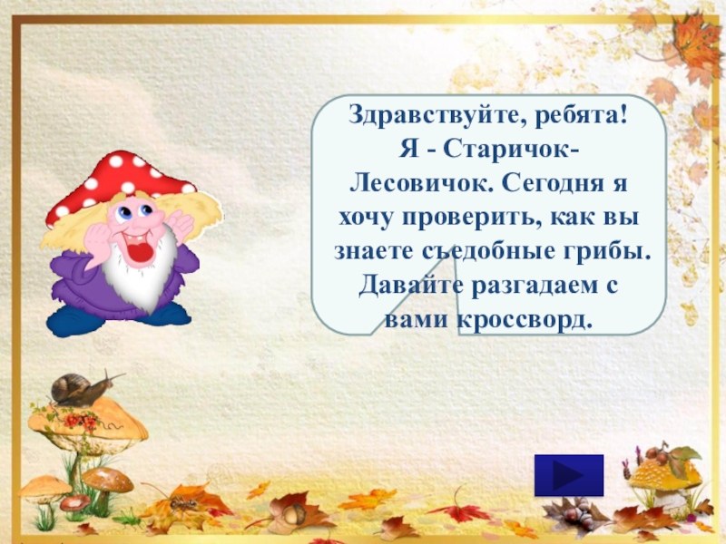 Здравствуйте, ребята!Я - Старичок-Лесовичок. Сегодня я хочу проверить, как вы знаете съедобные грибы. Давайте разгадаем с вами