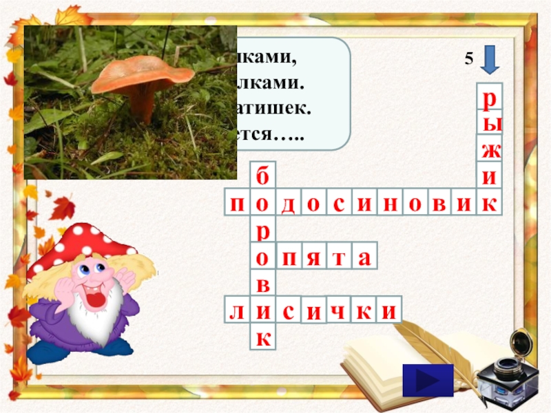 ырваклирвтяпкоичсиижикисонодбопОн живет под елками,Скрытый их иголками. Много у него братишек.Рыжий гриб зовется….. 5