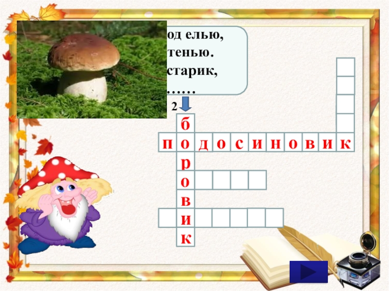 вирвкоикисонодбопЭтот гриб живет под елью,Под ее огромной тенью.Мудрый бородач-старик,Житель бора -……2