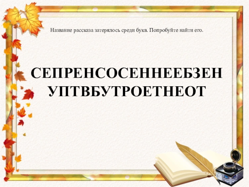 Слайд 11Название рассказа затерялось среди букв. Попробуйте найти его. СЕПРЕНСОСЕННЕЕБЗЕН УПТВБУТРОЕТНЕОТ