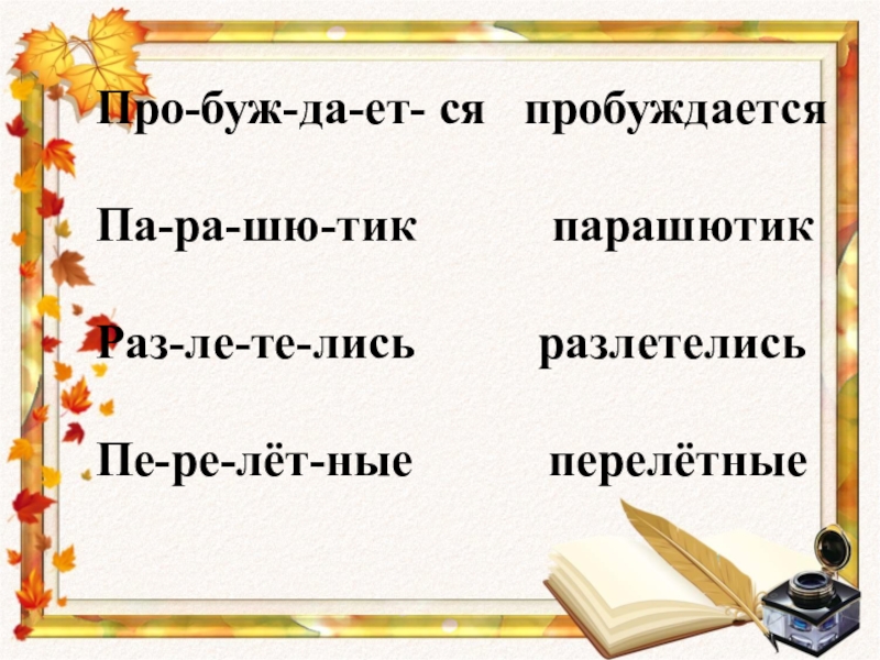Про-буж-да-ет- ся  пробуждаетсяПа-ра-шю-тик      парашютикРаз-ле-те-лись     разлетелисьПе-ре-лёт-ные