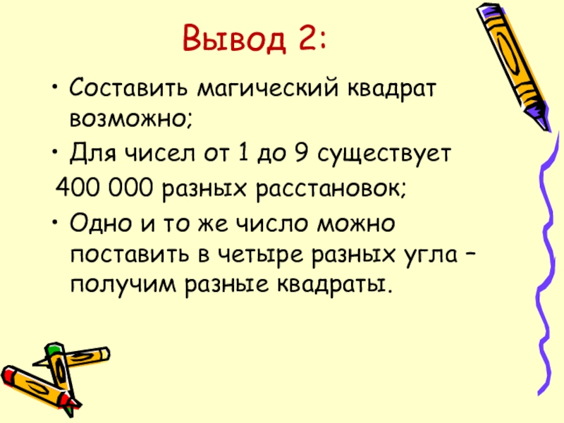 Вывод 2:Составить магический квадрат возможно;Для чисел от 1 до 9 существует 400 000 разных расстановок;Одно и то