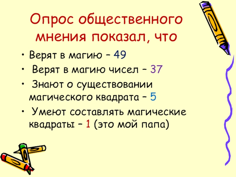 Опрос общественного мнения показал, чтоВерят в магию – 49 Верят в магию чисел – 37 Знают о