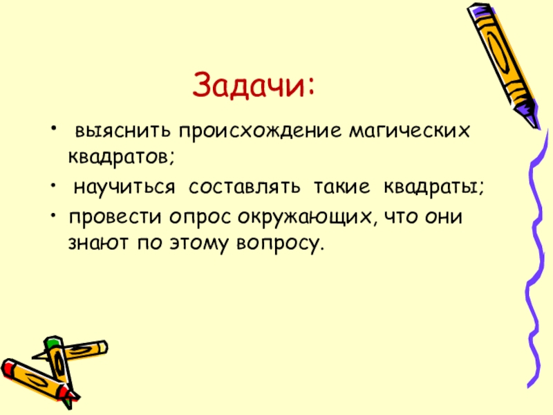 Задачи: выяснить происхождение магических квадратов; научиться составлять такие квадраты;провести опрос окружающих, что они знают по этому