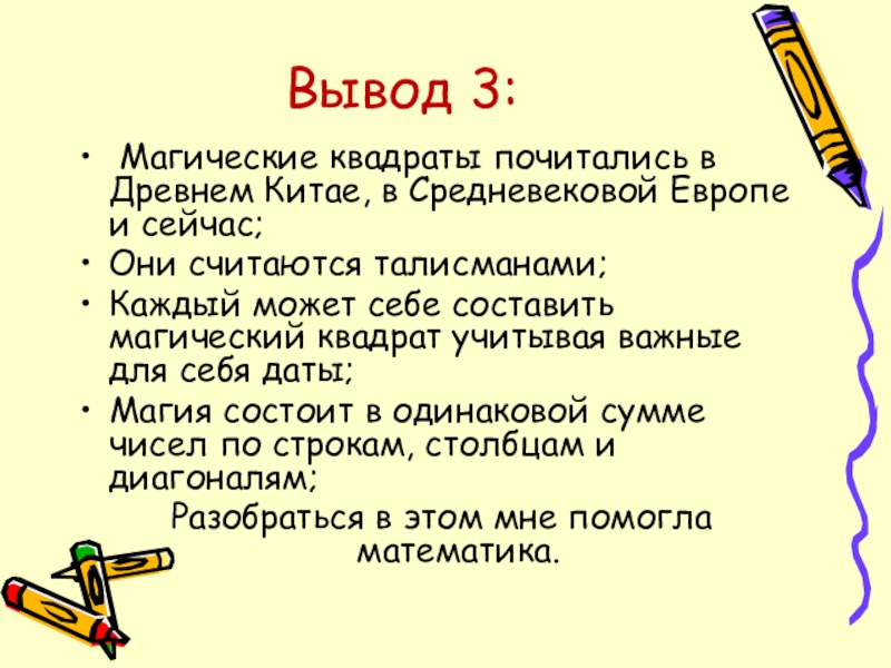 Вывод 3: Магические квадраты почитались в Древнем Китае, в Средневековой Европе и сейчас;Они считаются талисманами;Каждый может себе
