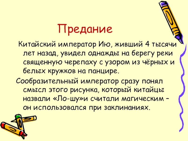 Предание Китайский император Ию, живший 4 тысячи лет назад, увидел однажды на берегу реки священную черепаху с
