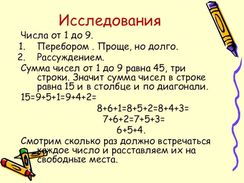 ИсследованияЧисла от 1 до 9.  Перебором . Проще, но долго. Рассуждением.Сумма чисел от 1 до 9