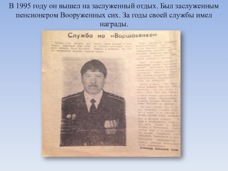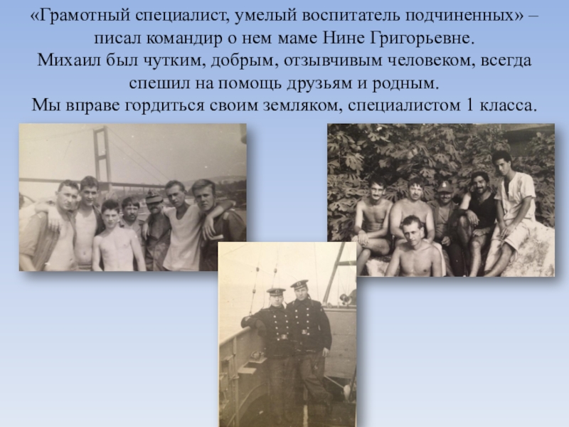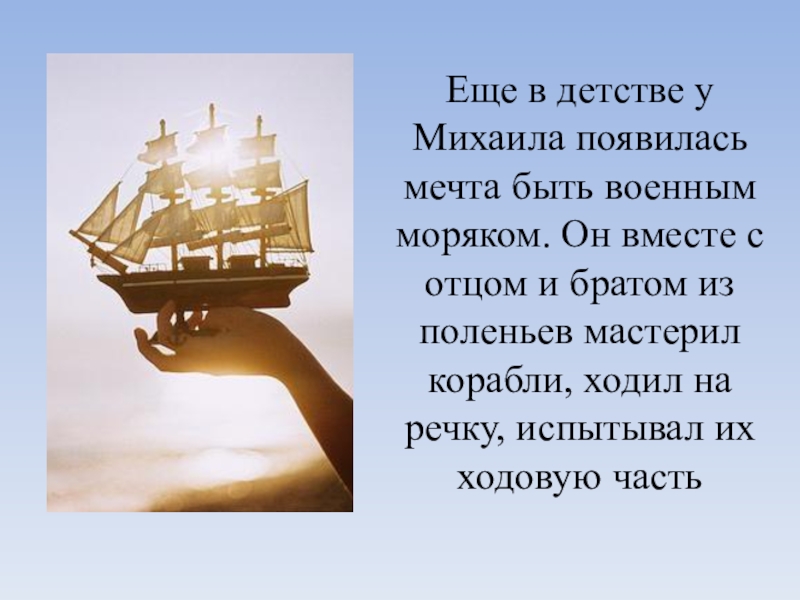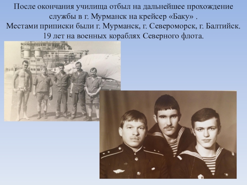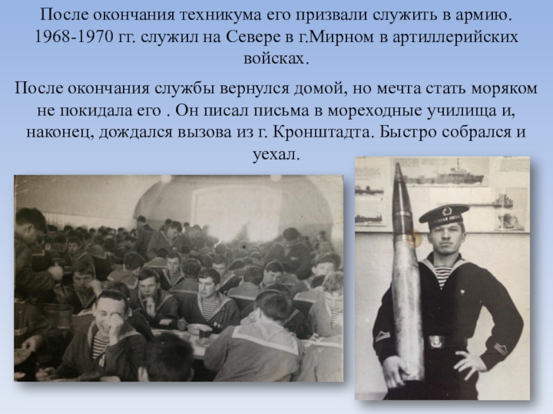 После окончания службы вернулся домой, но мечта стать моряком не покидала его . Он писал письма в мореходные училища и, наконец, дождался вызова из г. Кронштадта. Быстро собрался и уехал.