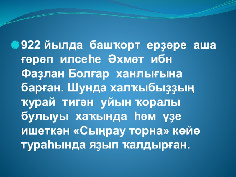 Слайд 28922 йылда башҡорт ерҙәре аша ғәрәп илсеһе Әхмәт ибн Фаҙлан Болғар
