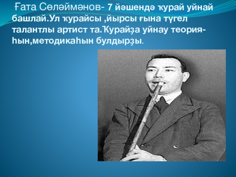 Слайд 33 Ғата Сөләймәнов- 7 йәшендә ҡурай уйнай башлай.Ул ҡурайсы ,йырсы ғына