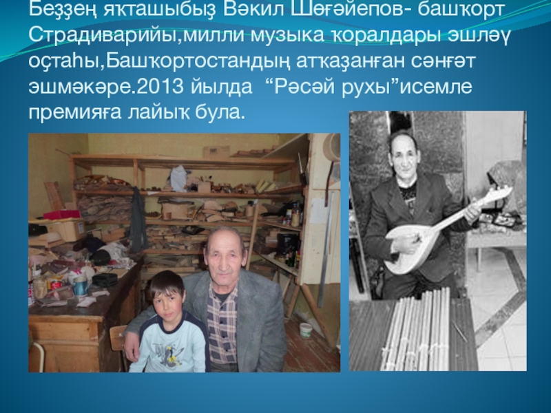 Слайд 44Беҙҙең яҡташыбыҙ Вәкил Шөғәйепов- башҡорт Страдиварийы,милли музыка ҡоралдары эшләү оҫтаһы,Башҡортостандың атҡаҙанған