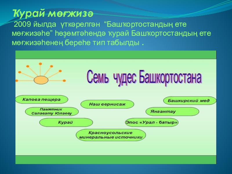 Слайд 22Ҡурай мөғжизә 2009 йылда үткәрелгән “Башҡортостандың ете мөғжизәһе” һөҙөмтәһендә ҡурай Башҡортостандың