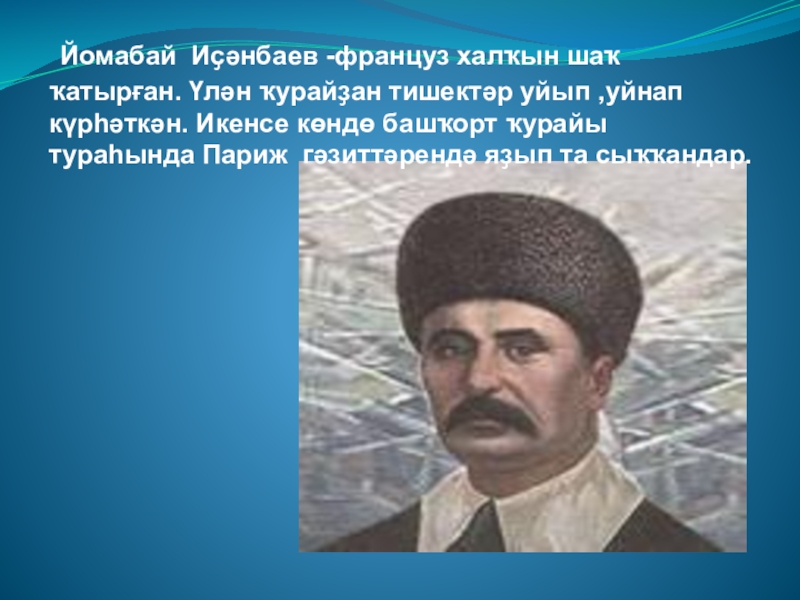 Слайд 38 Йомабай Иҫәнбаев -француз халҡын шаҡ ҡатырған. Үлән ҡурайҙан тишектәр уйып