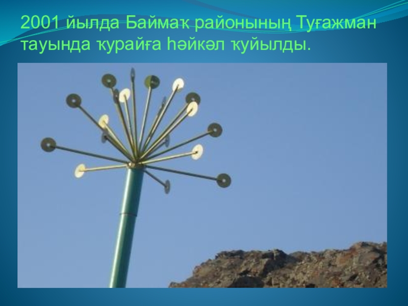 Слайд 252001 йылда Баймаҡ районының Туғажман тауында ҡурайға һәйкәл ҡуйылды.